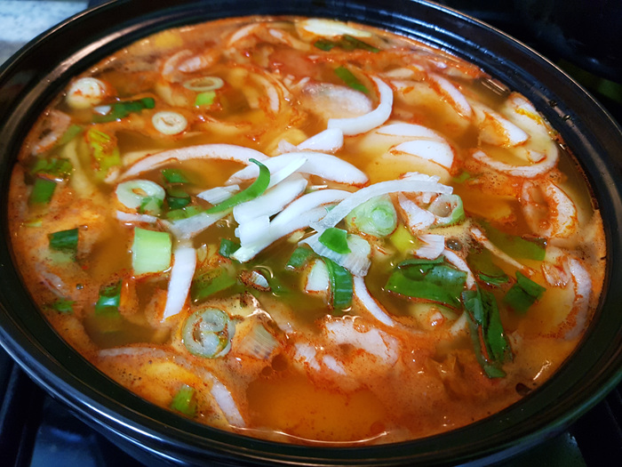 갖가지 소세지와 어울어진 조합 거기다 김치가 들어가 있어 시원한 느낌도 듭니다. 국물은 역시 김칫국물이잖아요.