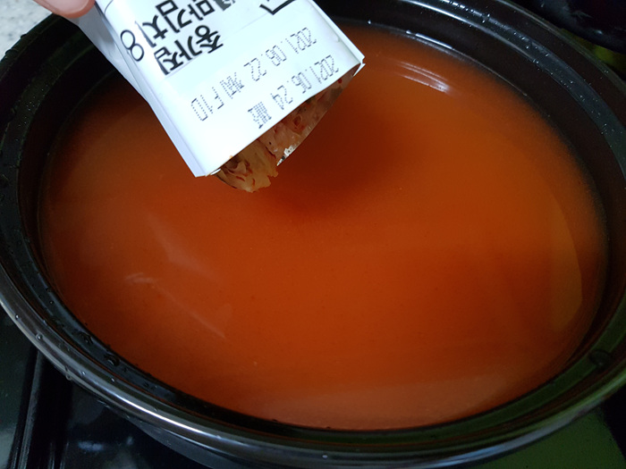 너무나도 간단해 그냥 막 끓인 듯 합니다. 물에 부대찌개 양념장을 넣고 잘 풀어 주세요.