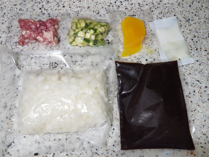 짜장면 밀키트 내용물은 고기, 호박, 당근, 소스, 단무지 그리고 면 2인분이 들어 있습니다.