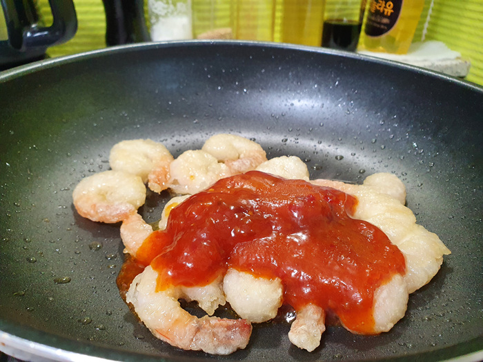 조리방법은 프라이팬에 기름을 넉넉히 붓고 가열한 후 냉동 상태 그대로 새우를 넣어 조리하고 그다음 소스를 버무려 한 번 더 조려주면 됩니다. 사실 쉽기는 한데 온 사방에 기름이 튄다는 단점이 있으니 프라이팬 덮개 꼭 준비하고 요리해 주세요.