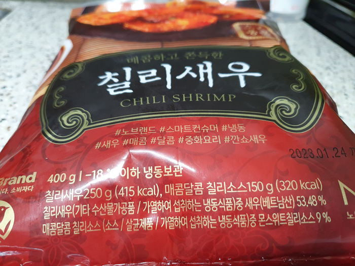 냉장고에 보니 맥주 안주로 손색이 없는 칠리새우가 있어 정말 괜찮겠다는 생각에 당장 꺼냈답니다. 이마트 노브랜드 코너에 가면 착한 가격에 칠리새우를 만날 수 있어요. 전 간혹 이마트 가면 노브랜드 코너는 필수로 들린답니다.