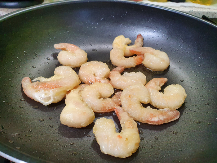 프라이팬에 새우를 넣고 중불에서 4분 정도 잘 익혀주는 게 관건입니다.