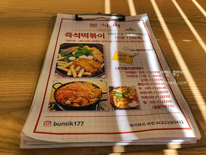 즉석 떡볶이는 2인 분 이상 가능해서 우린 1인 분씩 가능한 메뉴를 선별해 주문하기로 했다. 분식은 자고로 다양하게 먹어야 더 맛나다. 우린 불 떡볶이, 꼬마김밥, 크리스피 순살치킨을 주문했다. 가격이 그렇게 비싸지 않다는 생각에 이것저것 주문하니 한 끼 식사 가격이 되어 버렸다. 19,500원 ㅋㅋㅋㅋㅋ