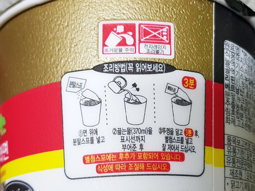 순후추 컵라면 조리방법도 자세히 나와 있습니다. 제일 먼저 면 위에 분말스프를 넣고 끓는 물(370ml)을 표시선까지 부어 준 후 뚜껑을 닫고 3분 후에 별첨스프를 넣고 저어 먹으면 됩니다. 여기서 별첨스프는 후추가 들어간 스프입니다.