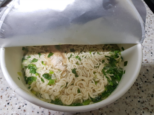 분말스프와 물을 넣고 뚜껑을 닫아 윗면을 보니 스프류중 백후추분말, 흑추후분말, 사골농축분말 그리고 사골양념분말, 사골액기스분말등이 들어 가네요. 왠지 푹 끓여진 사골국물에 라면을 끓이는 것 같은 느낌이 많이 듭니다.