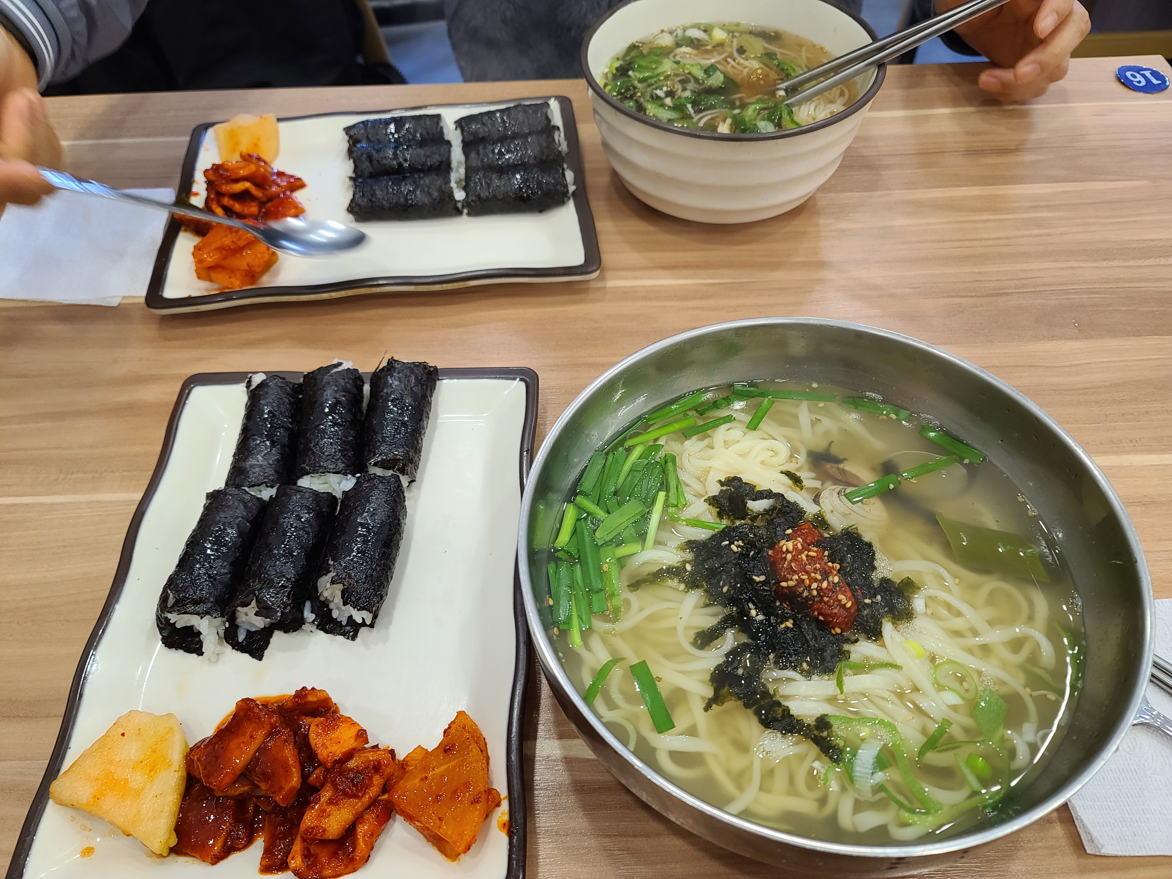 충무김밥과 국수가 세트로 나오는데 단돈 7,000원이고 국수 대신 칼국수를 주문하면 8,000원이랍니다. 정마을 저렴하죠. 물론 양도 제법 많아서 간단히 요기를 때우러 들어갔다가 배가 엄청 불렀답니다.