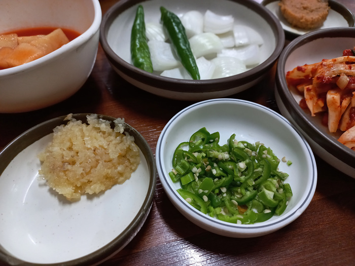 간마늘과 땡초 다진 것은 해장국, 내장탕에 넣어 먹는 양념입니다.