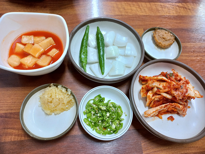 이곳에선 선지가 들어간 해장국과 내장이 듬뿍 들어간 내장탕 딱 2종류 메뉴만 있습니다. 음식을 주문하면 반찬은 깍두기, 김치와 고추,양파가 나옵니다. 사실 해장국에 이만한 반찬은 없을 것 같습니다. 김치 하나만 있어도 밥 한그릇은 뚝딱하니까요.