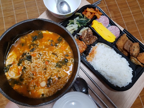편의점 도시락 하나랑 라면 한 개 끓여 놓으니 한끼 식사로 손색이 없었습니다.