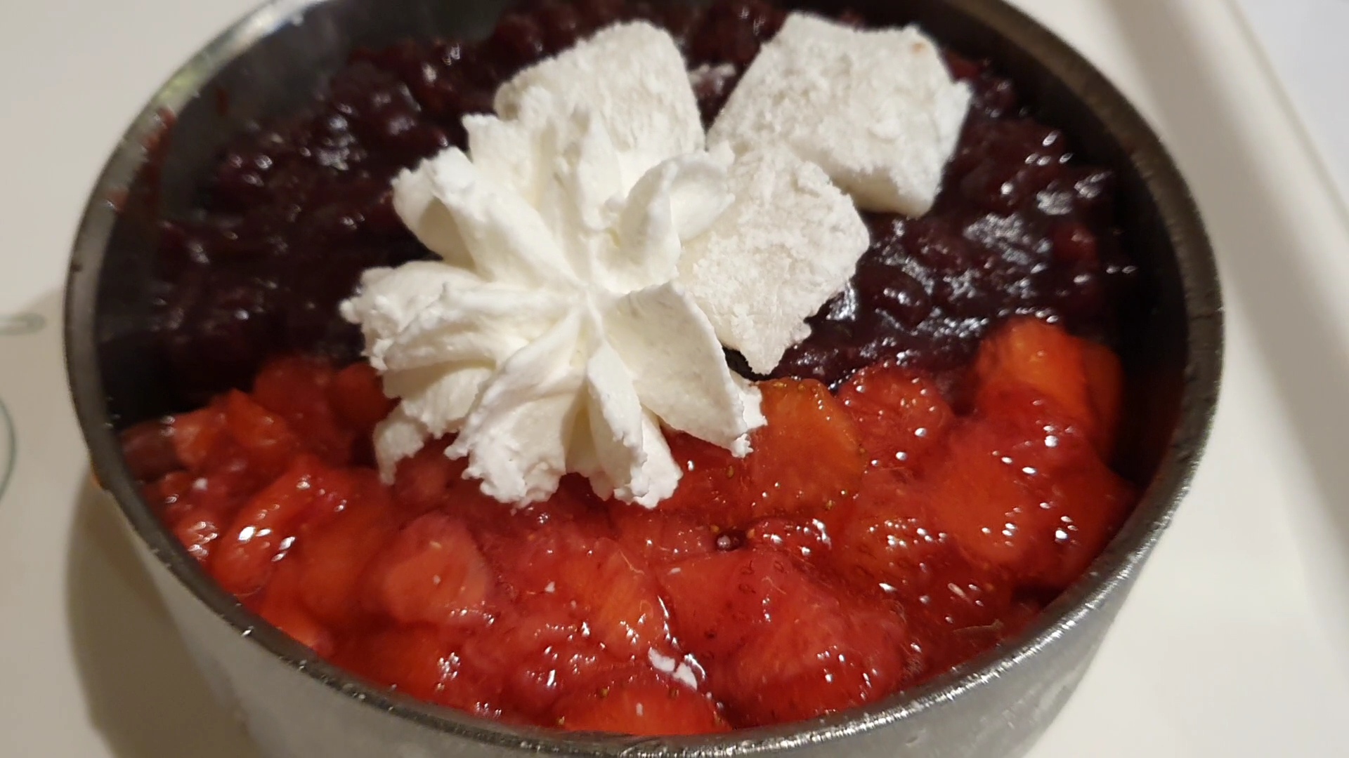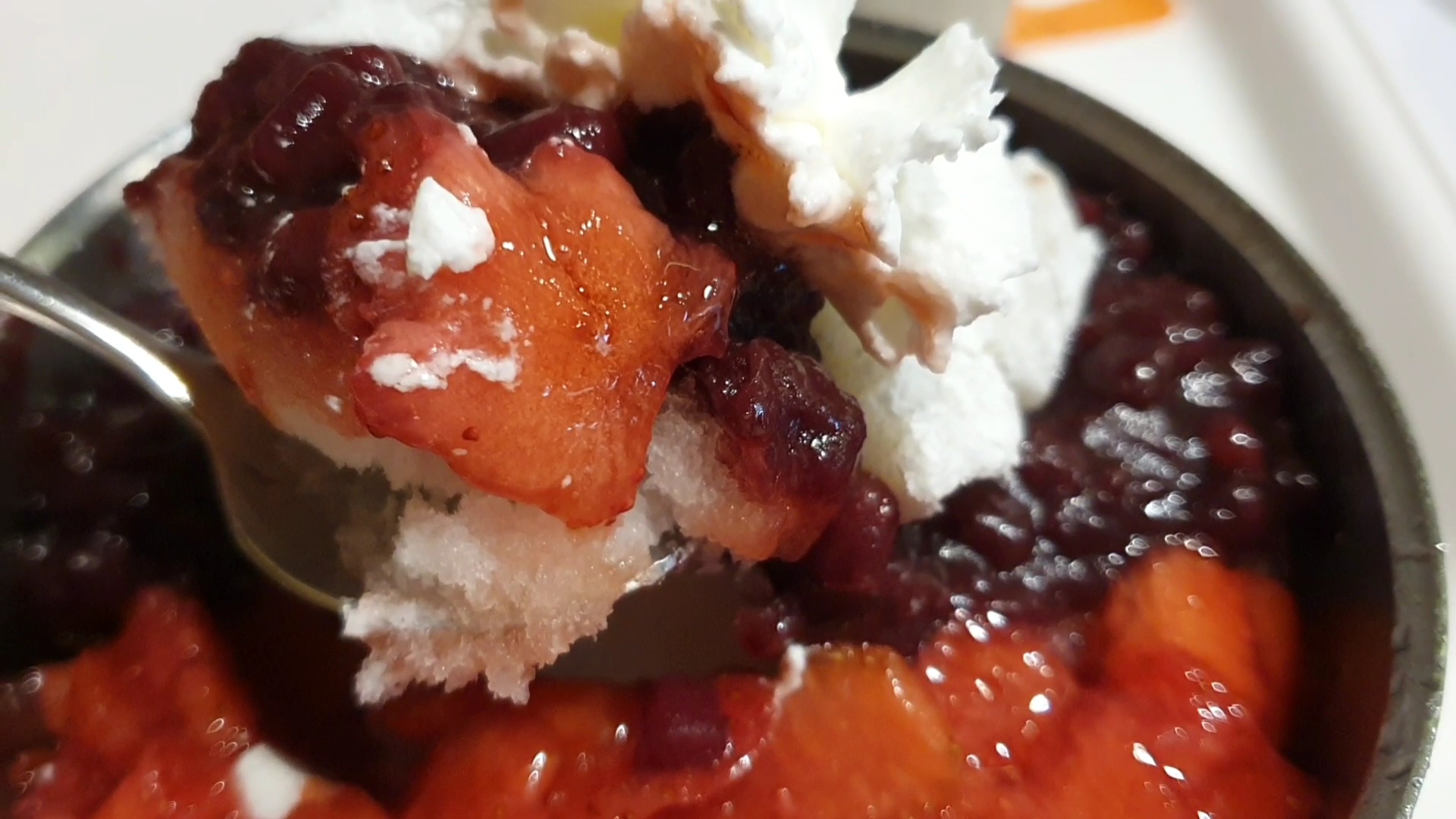 시원한 얼음 가루에 팥이랑 딸기잼 &소스 그리고 떡과 생크림이 올라갑니다.