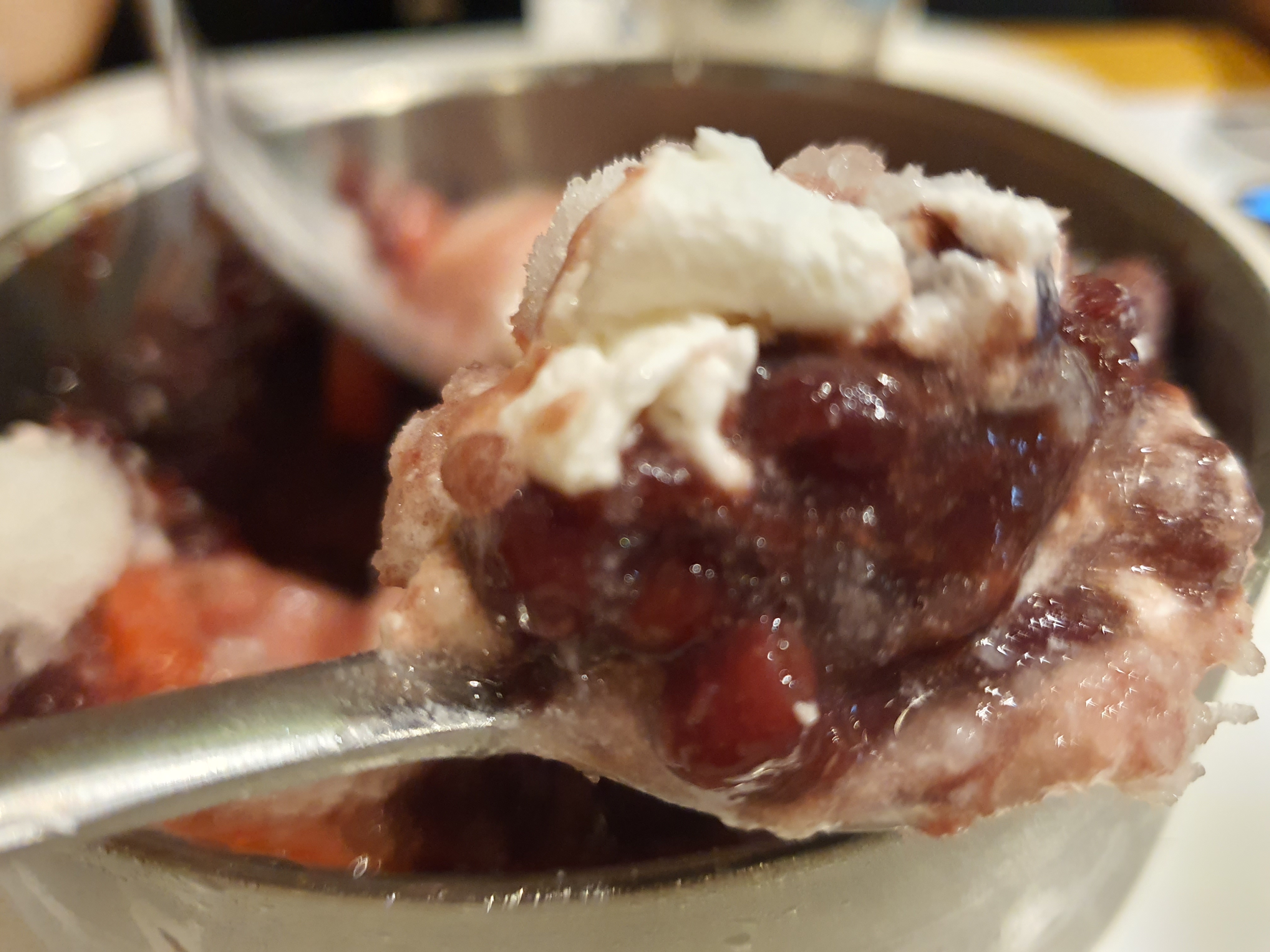 시원한 얼음 가루에 팥이랑 딸기잼 &소스 그리고 떡과 생크림이 올라갑니다.