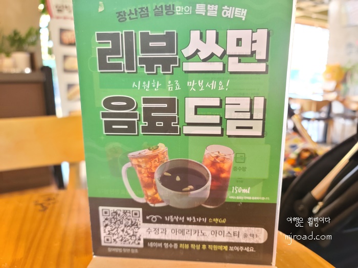 리뷰를 쓰면 시원한 음료도 준다는 안내 문구는 팥빙수를 기다리면서 하기에 딱 좋다.