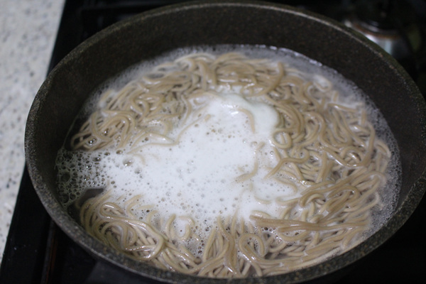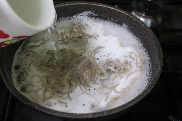 이렇게 생면을 넣고 물이 끓을 때 찬물을 넣어 끓이는 방법은 여느 음식점에서도 하는 방법이니 믿고 따라 하셔도 됩니다.
