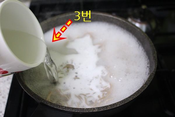 그리고 물이 또 끓으면 찬물을 한 번 더 조금 넣어 주고 다시 끓여 줍니다.