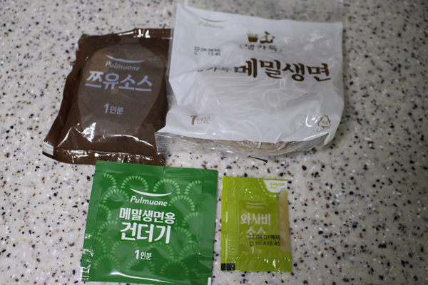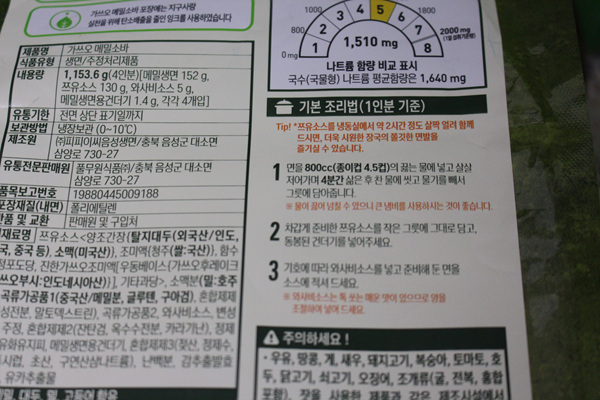내용물은 쯔유 소스, 메밀 생면, 건더기, 고추냉이 소스 이렇게 들어 있었습니다. (1인 분 기준 )