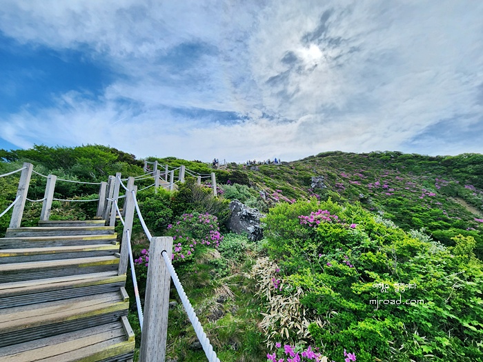 숲길을 지나 오르막길에 다다르면 나무계단이 나온다. 사실 이곳에서 내려다 보는 제주도 전경은 가히 절경이다. 날씨가 생각보다 많이 추워서일까... 철쭉은 거의 피지 않아 아쉬웠다. 철쭉이 완벽하게 피면 정말 멋진 한라산 영실코스인데 말이다.