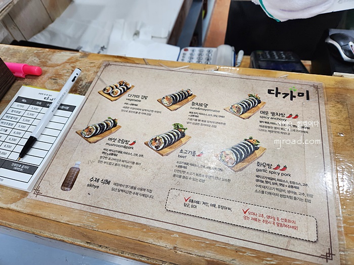 우리가 주문한건 매운 멸치쌈 김밥이다. 가격은 5,500원이다. 다른 김밥 가격도 거의 5,000원~ 5,500원 수준이다.