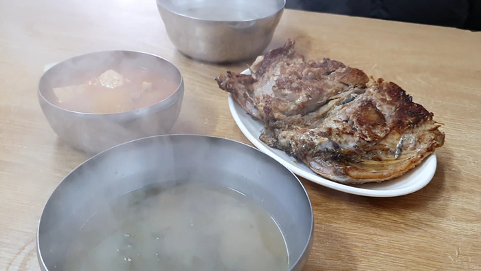 고등어정식 2인 분을 주문하자마자 재빠르게 된장국, 시레기국 그리고 고등어구이가 나왔습니다. 날씨가 추운데 문도 활짝 열고 장사를 해서 그런지 김이 모락모락 나더라고. 하여간 자갈치시장 장사하는 분들은 춥지도 않은지 대단하다는 생각이 들었답니다. ^^;;;;;