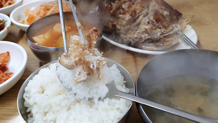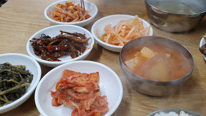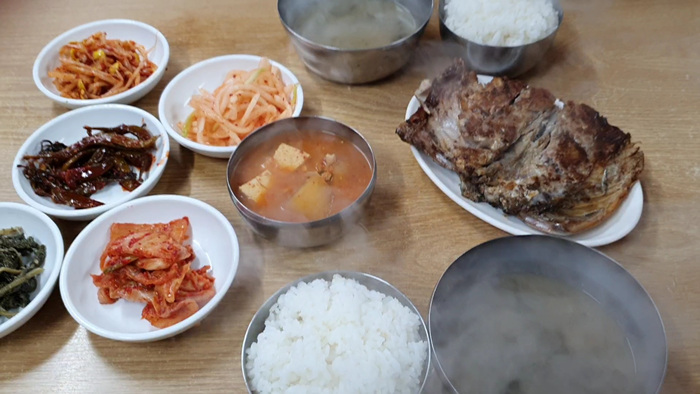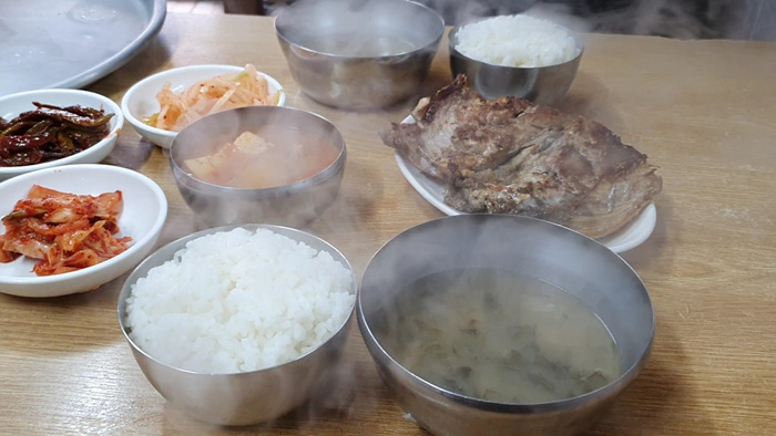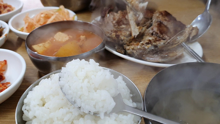 김이 모락모락 나는 가운데 갖가지 반찬들이 테이블 위에 놓여졌습니다. 밥은 고봉으로 넉넉히 나오더라고요.