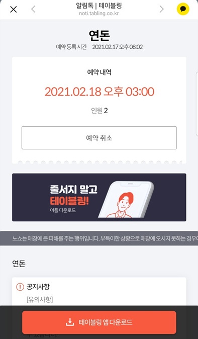 먼저 테이블링을 다운 받으시고 검색에 연돈을 치세요... 그리고 즉시예약 코너에 가서 인원수를 누르고 예약을 하면 되는데요.. 사실 말이 싶지 잘 안됩니다. 그래서 터득한 사실... 8시 되기 전 인원수를 누르고 '다음' 버튼을 1분 전 부터 왔다 갔다 누릅니다. 8시 땡하고 예약을 하면 이미 많은 사람들이 같이 하는 상황이라 잘 되지 않습니다. 아예 예약이 다 되었다는 문자만 뜨게 되지요. 물론 손동작도 엄청 빨라야 하니 연습도 필요하다는 사실..... 연습까지야?! 하고 생각했다간 예약 절대 못합니다. 손동작, 시간 잘 체크해 들어가야 합니다. ^^;;;;