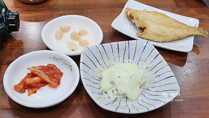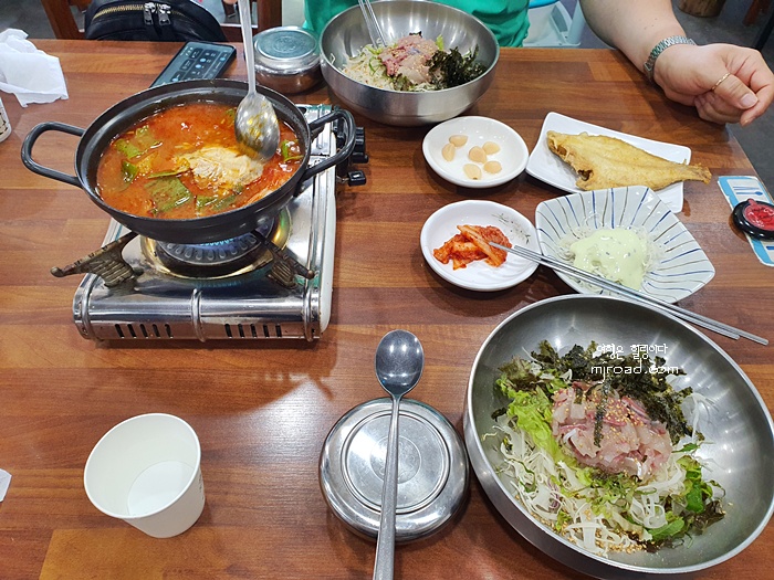 회덮밥을 주문하면 매운탕과 생선구이가 나온다. 반찬은 몇 가지 없긴 하지만 회덮밥 자체로만으로도 한 끼 식사가 되니 별로 게의치 않고 식사를 하게 된다. 물론 매운탕이 있기에 충분하다고 볼 수 있다. 재미 있는 것은 혼자가 가도 생선구이는 1마리가 나오고 두 명이 가도 생선구이가 한 마리가 나온다. 그래서인지 혼밥을 하러 오시는 분들이 많았다.