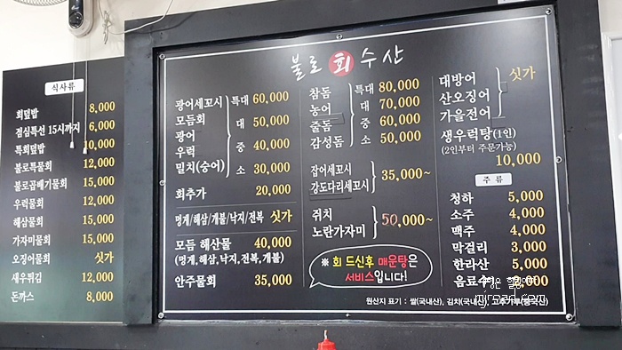 불로회수산은 불로전통시장과 가까워서 시장을 구경하다 출출해지면 한끼 식사로 먹기에 손색이 없을 듯 하다. 낮시간에 점심특선을 드시러 횟집에 오시는 분들이 정말 많았다.