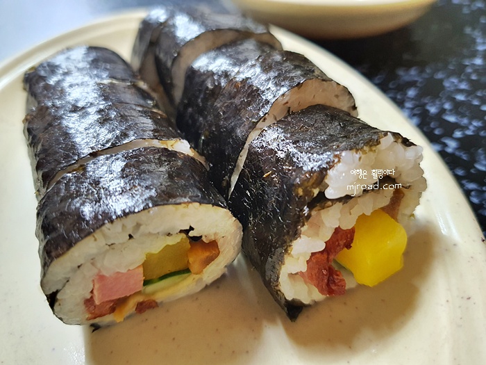 우리가 주문한 음식이 나왔다. 김밥은 생각보다 작은 크기였다. 마치 꼬마김밥 같은 사이즈라고 할까.. 조금 당황했다. 다른가게 보다 500원 더 비싼데 크기는 작으니 말이다. 그래도 간단히 먹을거라 더 주문하지는 않았다.