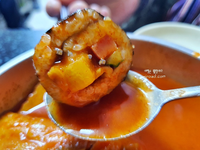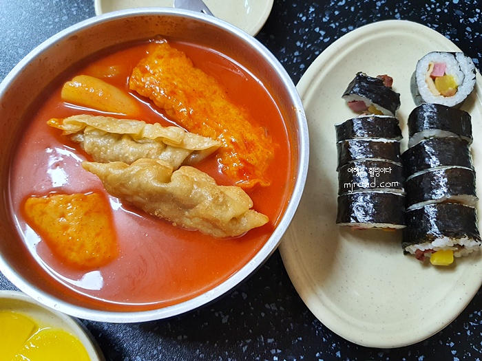 떡볶이와 김밥 두 가지를 주문하면 8,000원이다. 떡볶이 안에는 어묵과 만두 그리고 떡이 들어 있다. 국물 떡볶이의 모습이라 김밥이나 튀김을 찍어 먹기에 좋다.