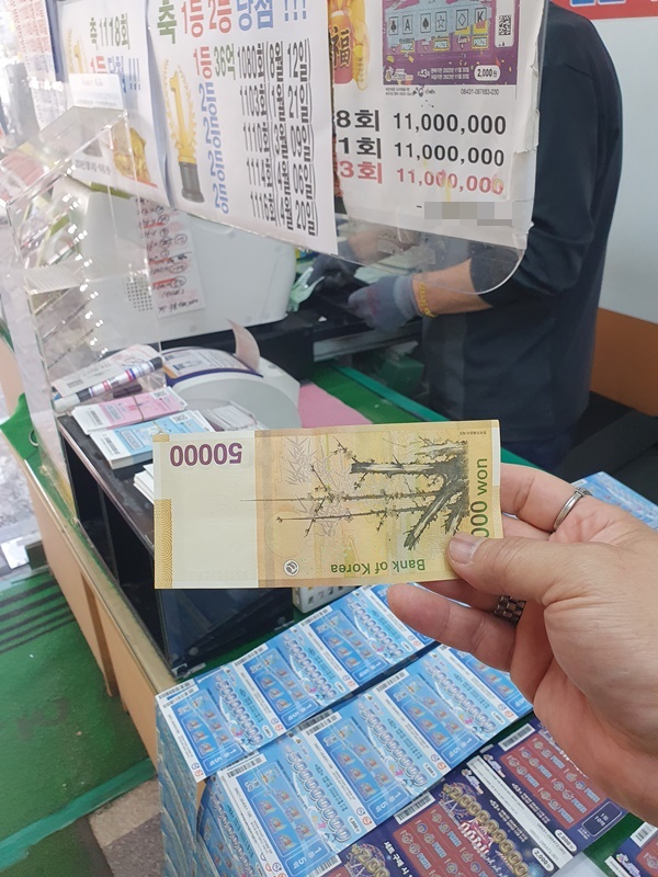 4등 당첨금 (50,000원)은 복권을 구입한 곳에서 바로 현금이나 복권으로 교환해 준다. 난 기분 좀 내려고 현금 50,000원을 받았다. 4등은 수수료도 없어서 기분이 더 좋았다.