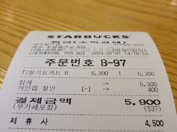 평소 스타벅스에 가면 텀블러를 들고 가는 편입니다. 그럴때마다 400원의 할인을 받아요. 요즘엔 환경을 생각해 일부러 텀블러를 챙겨 가시는 분들이 많긴 하더라고요.