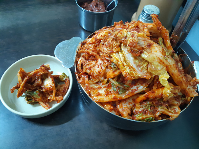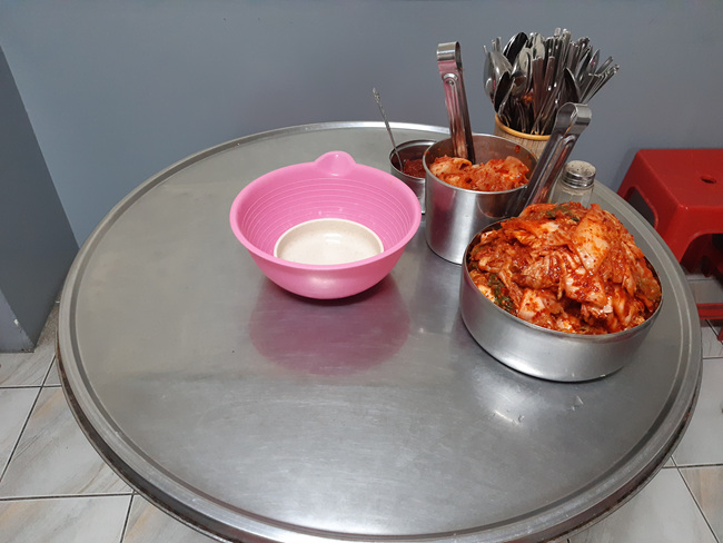 내부는 칼국수집답게 소담스러운 분위기입니다. 그런데 참 특이하게 김치가 한가득 담겨 테이블마다 있었습니다. 셀프로 먹을 만큼 덜어 먹어란 이야기겠죠.