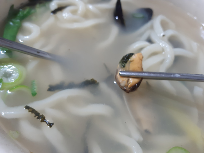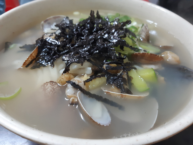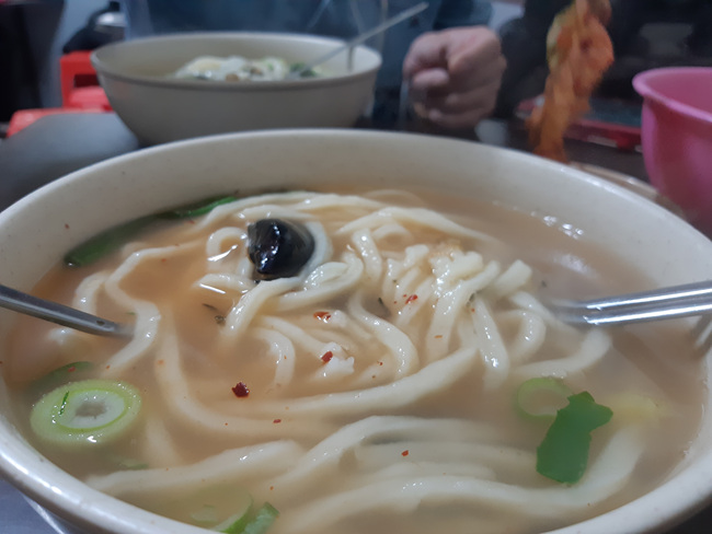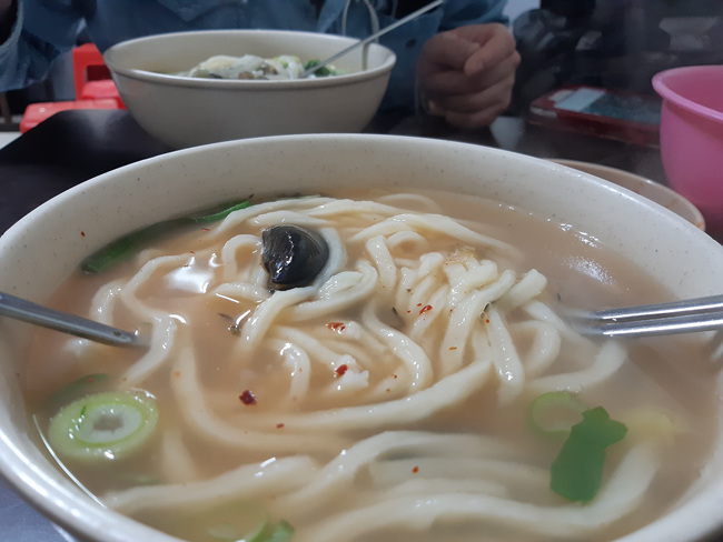 드디어 칼국수가 나왔습니다. 보기에는 그냥 일반 칼국수와 별 차이가 없어 보입니다. 하지만 국물 한 숟가락 떠먹어 보면 놀랍니다. 정말 깔끔하니 시원합니다.