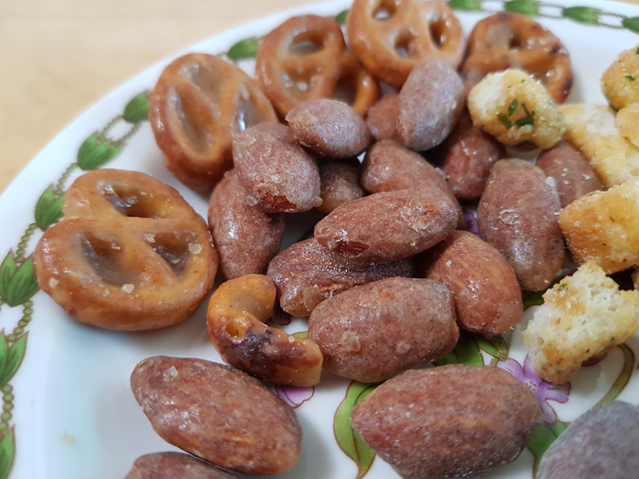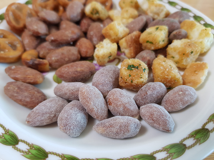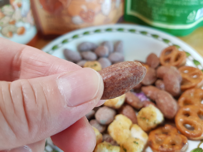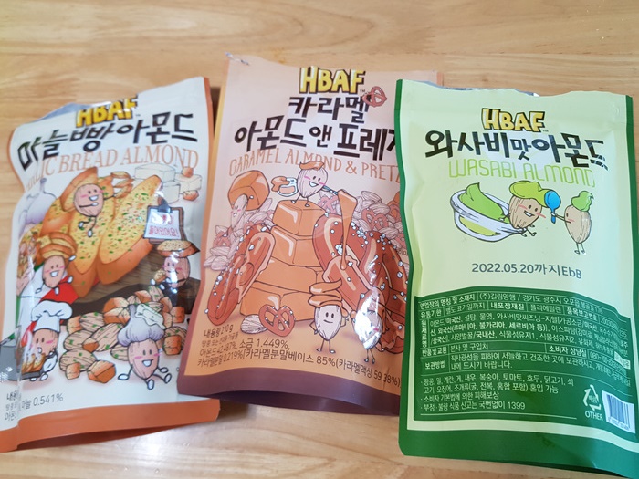 사실 구입해 와서 개봉하기 전까지는 마늘빵 맛이 나는 아몬드, 카라멜 맛이 나는 아몬드인 줄 알았는데 마늘빵과 카라멜 맛이 나는 프레첼이 들어 있어 조금 당황했습니다. 아몬드만 들어 있는건 와사비맛 아몬드였는데 이 또한 먹으면서 웃음이 나더군요.