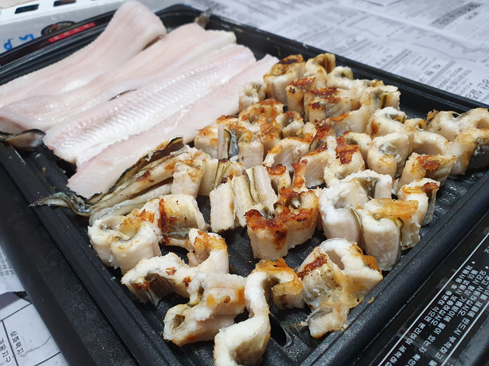민물장어와 달리 바다장어 특유의 내음이 코끝을 자극했습니다. 침샘이 계속 날 정도더군요. 예전에 기장에서 먹었던 그 냄새가 솔솔~~ 나더라고요. 숯불이 아니라 그게 정말 아쉬웠습니다. 숯불이면 완전 대박이라는 말이 절로 나왔을 장어냄새인데....