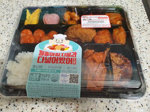 도시락 이름은 ' 뭘 좋아하는지 몰라 다 넣어 봤어 '입니다. 재밌죠... 가격은 5,500원이고요. 안심 뚜껑 이유로 전자레인지에 안심하고 데워 먹을 수 있습니다. 사실 대부분 도시락이 다 그렇겠지만요.. 반찬 가짓수가 많아서 그런지 920kcal 나 되네요. 참고하시고 드시면 될 것 같습니다.