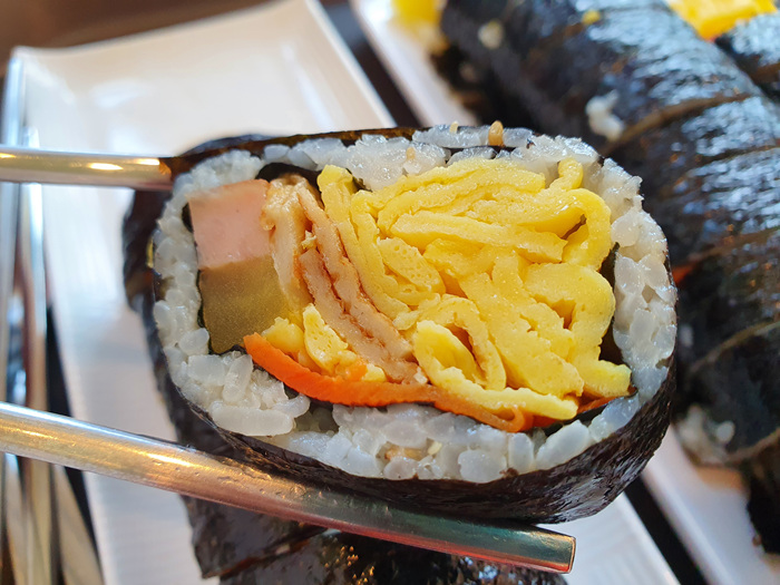 김밥 하나를 먹으려고 자세히 보니 김밥 속 내용물이 정말 알차게 들어 있었습니다.