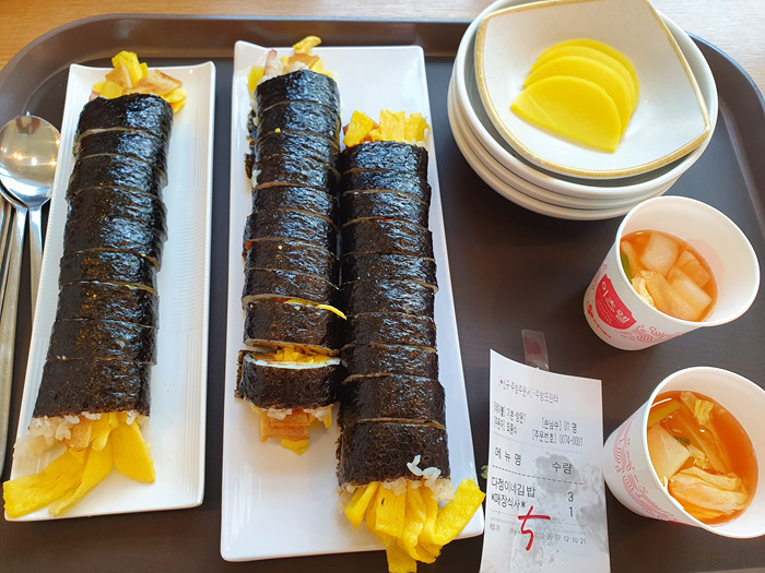 2명이서 기본 김밥 2 줄을 주문하려니 혹시 양이 적을 수도 있겠다 싶어 3개를 주문했다가 너무 많은 양에 놀랐습니다.